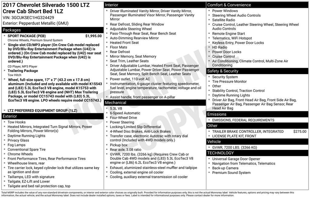 LOCAL TRADE, NON SMOKER, APPLE CARPLAY, ANDROID AUTO, Silverado 1500 LTZ 1LZ, 4D Crew Cab, EcoTec3 5.3L V8, 6-Speed Automatic Electronic with Overdrive, 4WD, Pepperdust Metallic, Cocoa/Dune Leather, Sport Package, Trailering Package, Wheels: 20 x 9 Chrome.