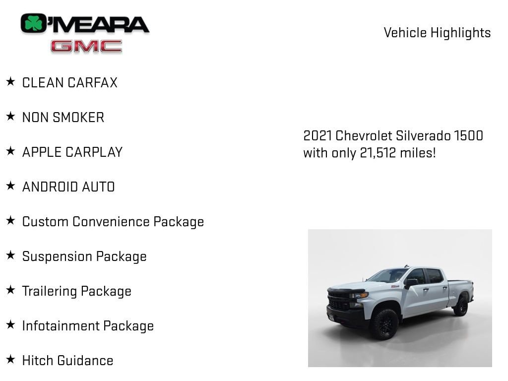 CLEAN CARFAX, NON SMOKER, APPLE CARPLAY, ANDROID AUTO, Silverado 1500 Custom Trail Boss, 4D Crew Cab, EcoTec3 5.3L V8, 6-Speed Automatic Electronic with Overdrive, 4WD, White, Cloth, Custom Convenience Package, Electric Rear-Window Defogger, EZ Lift Power Lock & Release Tailgate, Fully automatic headlights, Heavy-Duty Air Filter, Hill Descent Control, Hitch Guidance, Infotainment Package, LED Cargo Area Lighting, OnStar & Chevrolet Connected Services Capable, Premium audio system: Chevrolet Infotainment 3, Remote Vehicle Starter System, SiriusXM Radio, Suspension Package, Trailering Package, Variably intermittent wipers.