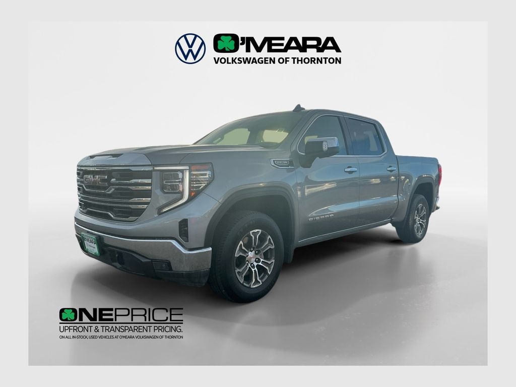 Sierra 1500 SLT, 4D Crew Cab, EcoTec3 5.3L V8, 10-Speed Automatic, 4WD, Sterling Metallic, Jet Black w/Cloth Seat Trim, 10-Way Power Driver Seat Adjuster w/Lumbar, 10-Way Power Passenger Seat Adjuster w/Lumbar, 120-Volt Bed Mounted Power Outlet, 120-Volt Interior Power Outlet, 170 Amp Alternator, 2 Charge/Data USB Ports, 2 Type-C Charge-Only Rear USB Ports, 3.23 Rear Axle Ratio, 4-Wheel Disc Brakes, 6 Speakers, 6-Speaker Audio System Feature, ABS brakes, Air Conditioning, AM/FM radio: SiriusXM with 360L, Apple CarPlay/Android Auto, Auto High-beam Headlights, Auto-dimming door mirrors, Auto-dimming Rear-View mirror, Auto-Locking Rear Differential, Automatic Emergency Braking, Automatic temperature control, Auxiliary External Transmission Oil Cooler, Brake assist, Buckle to Drive, Bumpers: chrome, Chrome Header & Chrome Grille Insert Bars, Color-Keyed Carpeting Floor Covering, Compass, Deep-Tinted Glass, Delay-off headlights, Driver door bin, Driver Memory, Driver vanity mirror, Dual front impact airbags, Dual front side impact airbags, Electric Rear-Window Defogger, Electronic Stability Control, Following Distance Indicator, Forward Collision Alert, Front 40/20/40 Split-Bench Seat, Front anti-roll bar, Front Center Armrest w/Storage, Front dual zone A/C, Front fog lights, Front Frame-Mounted Black Recovery Hooks, Front Pedestrian Braking, Front Rain-Sensing Wipers, Front reading lights, Front wheel independent suspension, Fully automatic headlights, GMC Connected Access Capable, HD Rear Vision Camera, Heated door mirrors, Heated Driver & Front Outboard Passenger Seating, Heated front seats, Heated steering wheel, Hitch Guidance, Illuminated entry, IntelliBeam Automatic High Beam On/Off, Keyless Open & Start, Lane Keep Assist w/Lane Departure Warning, LED Cargo Area Lighting, Low tire pressure warning, Manual Tilt-Wheel & Telescoping Steering Column, Memory seat, Navigation System, Occupant sensing airbag, OnStar & GMC Connected Services Capable, Outside temperature display, Overhead airbag, Overhead console, Panic alarm, Passenger door bin, Passenger vanity mirror, Perf Leather-Appointed Front Outboard Seat Trim, Perimeter Lighting, Power Door Locks, Power door mirrors, Power driver seat, Power Front Passenger Windows w/Express Up/Down, Power Front Windows w/Driver Express Up/Down, Power passenger seat, Power Rear Windows w/Express Down, Power steering, Power windows, Premium audio system: GMC Infotainment System, Push Button Start, Radio data system, Radio: Premium GMC Infotainment Audio System, Rain sensing wipers, Rear reading lights, Rear seat center armrest, Rear step bumper, Rear Wheelhouse Liners, Rear window defroster, Remote keyless entry, Remote Vehicle Starter System, Security system, SiriusXM w/360L, Speed control, Speed-sensing steering, Split folding rear seat, Standard Suspension Package, Steering Wheel Audio Controls, Steering wheel mounted audio controls, Tachometer, Telescoping steering wheel, Theft Deterrent System (Unauthorized Entry), Tilt steering wheel, Traction control, Trailering Package, Trip computer, Variably intermittent wipers, Voltmeter, Wheels: 18" x 8.5" 6-Spoke Machined Aluminum, Wi-Fi Hotspot Capable, Wireless Apple CarPlay/Wireless Android Auto.