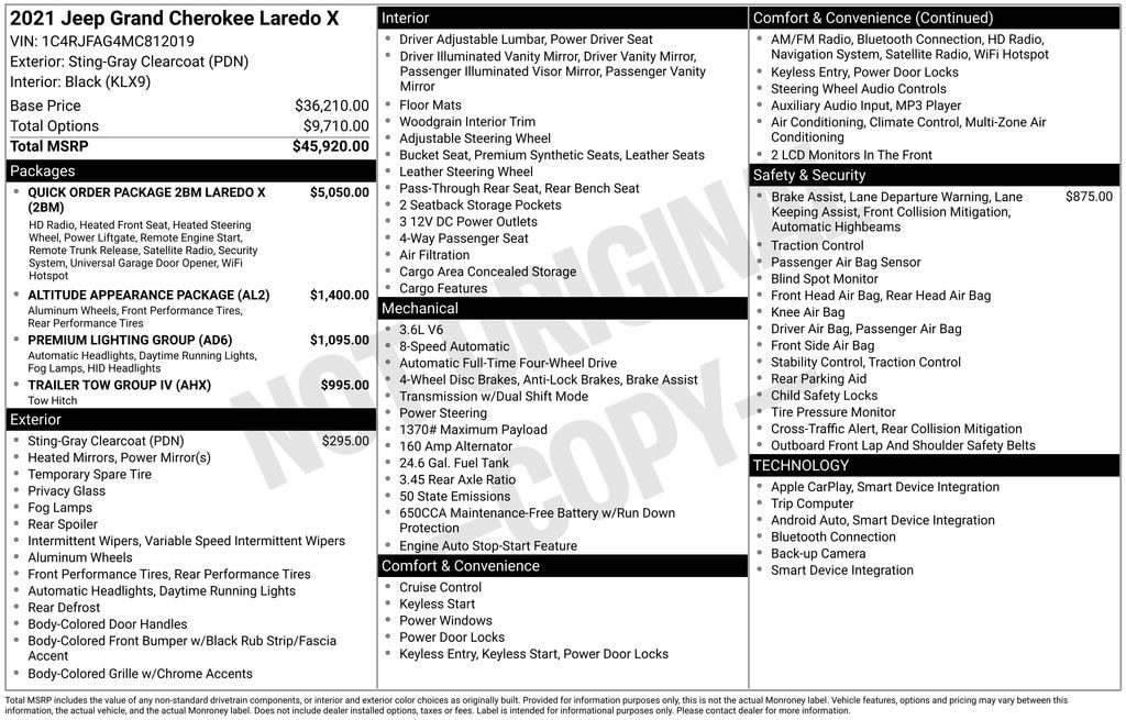 CLEAN CARFAX, NON SMOKER, APPLE CARPLAY, ANDROID AUTO, POWER LIFTGATE, Grand Cherokee Laredo X, 4D Sport Utility, 3.6L V6 24V VVT, 8-Speed Automatic, 4WD, Sting-Gray Clearcoat, Black Leather, 180 Amp Alternator, 6 Speakers, 7 & 4 Pin Wiring Harness, Advanced Brake Assist, Altitude Appearance Package, Altitude Grille, AM/FM radio: SiriusXM, Auto High Beam Headlamp Control, Bi-Xenon High-Intensity Discharge Headlamps, Black Roof Molding, Black Suede Seats w/Black Stitching, Body Color Claddings, Body Color Fascia, Body Color Shark Fin Antenna, Bridgestone Brand Tires, Bumpers: body-color, Class IV Receiver Hitch, Dark Day Light Opening Moldings, Dark Headlamp Bezel Finish, Dark Lens Taillamps, Delete Laredo Badge, Front Accent/Body Color Fascia, Front LED Fog Lamps, Full Speed FWD Collision Warn Plus, Gloss Black Jeep Badging, Gloss Black Rear Fascia Applique, GPS Navigation, Heated Front Seats, Heated Steering Wheel, Heavy-Duty Engine Cooling, Lane Departure Warning Plus, LED Daytime Running Headlamps, Navigation System, Power door mirrors, Power Liftgate, Premium Lighting Group, Protech II, Quick Order Package 2BM Laredo X (DISC), Radio: Uconnect 4C Nav w/8.4 Display, Rear Accent/Body Color Fascia, Rear Fascia Black Molded in Color Step Pad, Rear Load Leveling Suspension, Remote Start System, Security Alarm, Single Exhaust w/Bright Tip, Steering Wheel Mounted Audio Controls, Trailer Tow Group IV, Universal Garage Door Opener, Wheels: 20 x 8.0 Gloss Black Aluminum.