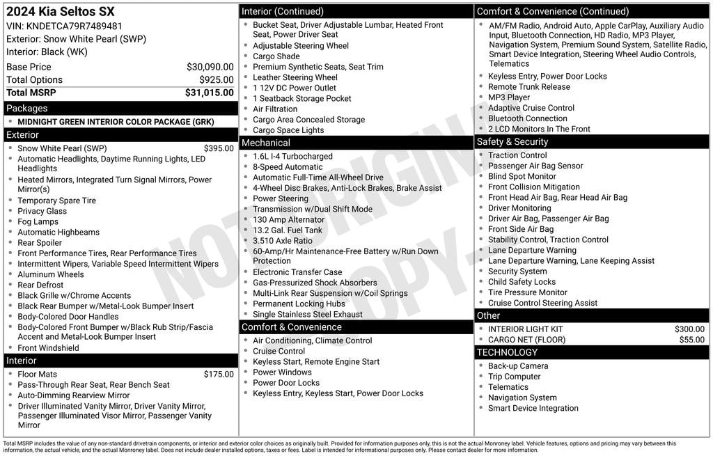 LOCAL TRADE, NON SMOKER, APPLE CARPLAY, ANDROID AUTO, Seltos SX, 4D Sport Utility, I4, 8-Speed Automatic, AWD, Snow White Pearl, Black Artificial Leather, Apple CarPlay & Android Auto, Automatic temperature control, Exterior Parking Camera Rear, Fully automatic headlights, Midnight Green Interior Color Package, Navigation System, Radio: AM/FM/HD/Satellite Display System w/Navigation, Steering wheel mounted audio controls.