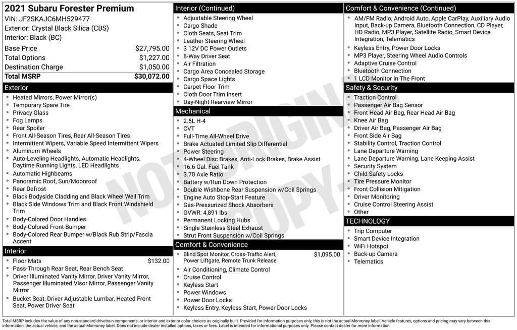 CLEAN CARFAX, NON SMOKER, APPLE CARPLAY, ANDROID AUTO, Forester Premium, 4D Sport Utility, 2.5L 4-Cylinder DOHC 16V VVT, Lineartronic CVT, AWD, Crystal Black Silica, Black w/Cloth Upholstery, 6 Speakers, AM/FM radio: SiriusXM, Blind Spot Detection (BSD), Blind Spot Detection w/RCTA & Power Rear Gate, CD player, Driver's Seatback Divided Pocket, Multi-Function High Grade Display, Power Rear Gate w/Automatic Close & Height Memory, Radio data system, Radio: Subaru Starlink 6.5 Multimedia Plus System.