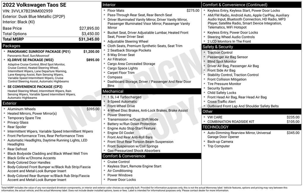 LOCAL TRADE, CLEAN CARFAX, NON SMOKER, APPLE CARPLAY, ANDROID AUTO, HEATED FRONT SEATS, Taos 1.5T SE, 4D Sport Utility, 1.5L I4 Turbocharged DOHC 16V LEV3-SULEV30 158hp, Automatic, Dusk Blue Metallic, Black w/CloudTex & Cloth Seating Surfaces, Electronic Stability Control, Exterior Parking Camera Rear, Fully automatic headlights, Panoramic Sunroof Package, Radio: MIB3 Composition Media AM/FM/HD, Steering wheel mounted audio controls, Variably intermittent wipers.